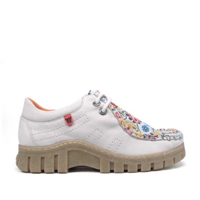 On this version in Flower Power White you will shine. The attractive floral print on a summery silver-gray background immediately puts you in a cheerful mood. The shoes are made of soft nubuck leather, the print is also on this luxurious leather. A shoe suitable for many different wearing occasions.